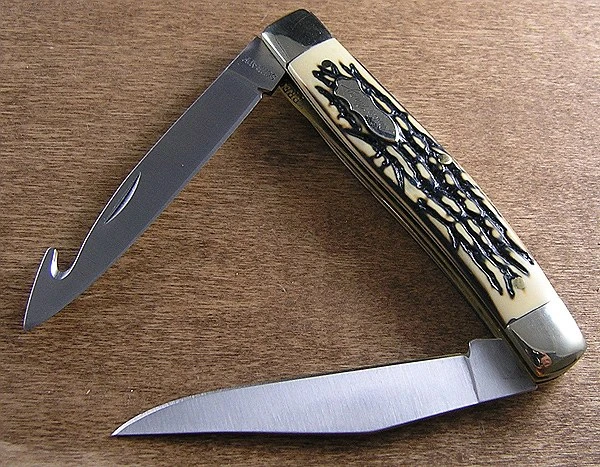 Couteau Schrade Uncle Henry Pro Skinner pliant – Longueur fermé 9.84cm – 2 Lames en acier carbone – Lame de type clip and guthook skinner – Longueur de lame 7.6cm – Platines et mitres en nickel – Plaquettes du manche en Delrin façon bois de cerf – Logo Uncle Henry incrusté dans le manche – Système de sécurité