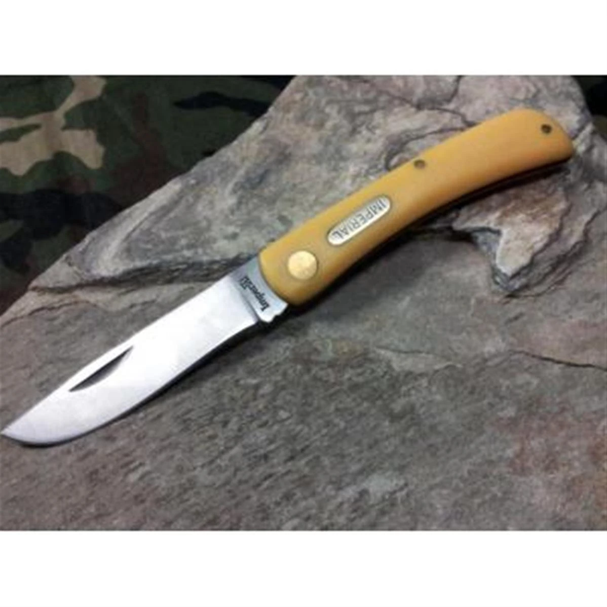 Lot de 3 Canifs Imperial Schrade pliant – Longueur fermé 9.20cm – Lame en acier inox – Platines en nickel – Plaquettes du manche en abs couleur jaune – Ecusson incrusté dans le manche