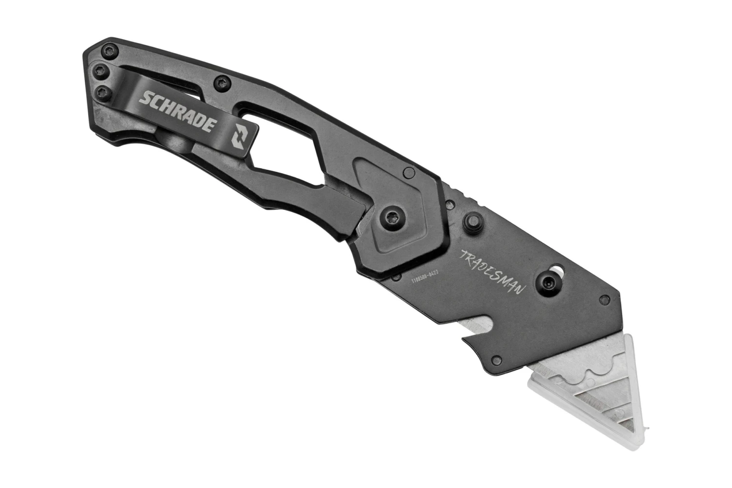 Est-ce un cutter ou un couteau de poche ? Le Schrade Tradesman 1159300 est une combinaison des deux ! C’est d’une part un couteau pliant, mais avec une lame de cutter. Un système de verrouillage vous permet de faire sortir la lame, pour couper la partie usée. De quoi toujours avoir une lame bien tranchante. Le manche est en acier inoxydable. La lame s’ouvre avec le repose-pouce, pour ensuite être verrouillée par un framelock. Vu que la lame se replie, ce couteau est très compact et est facile à emporter partout.